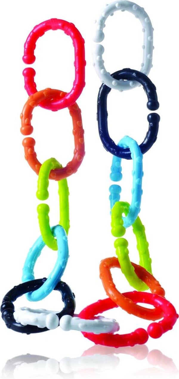 12 schakels die kunnen worden verbonden met kinderwagens of babybedjes. Geweldig voor wanneer kindjes tandjes krijgen en er kan ook mee gespeeld worden.
