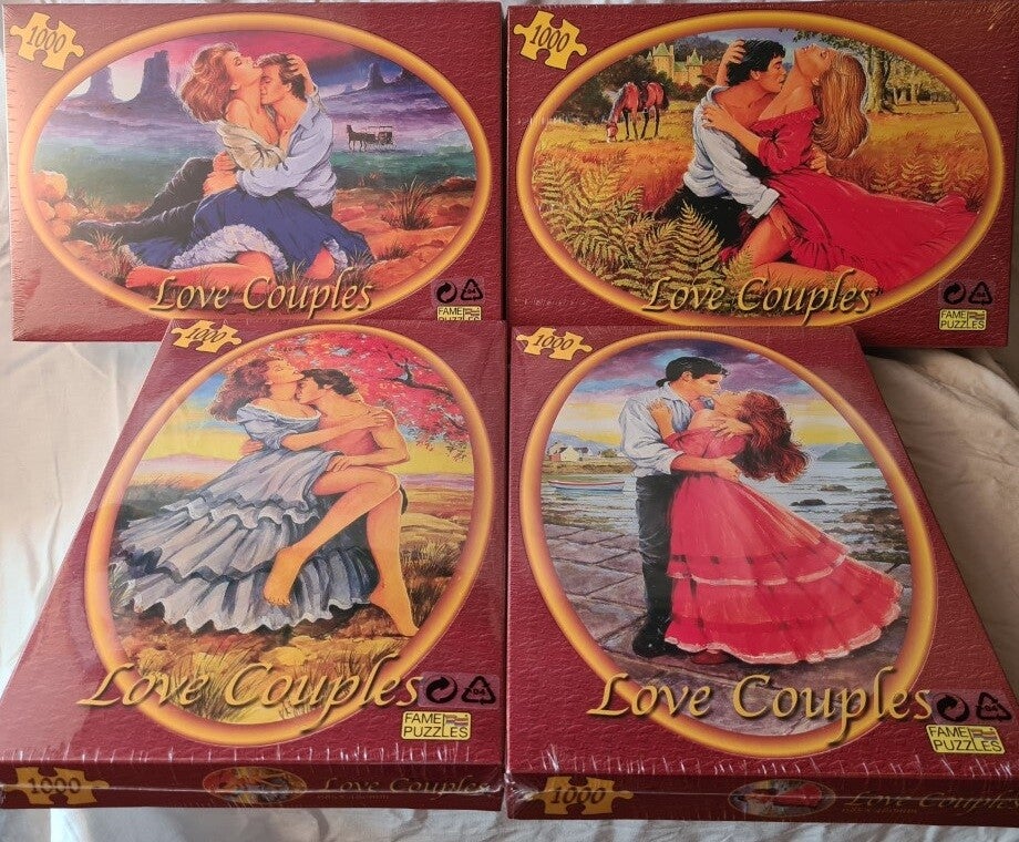 set van 4 puzzels - 4 x 1000 stukjeselke puzzel 1000 stukjes.afmeting: 685 x 480 mm per puzzelafbeelding van 4 romantische love koppels.merk: fame puzzles.