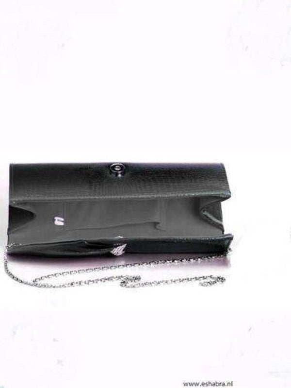 zwart bruids/avond tasje.(g)•+- 28 cm lang,+- 11cm hoog,+- 5cm breed.•metalen ketting:+- 120 cm lang.